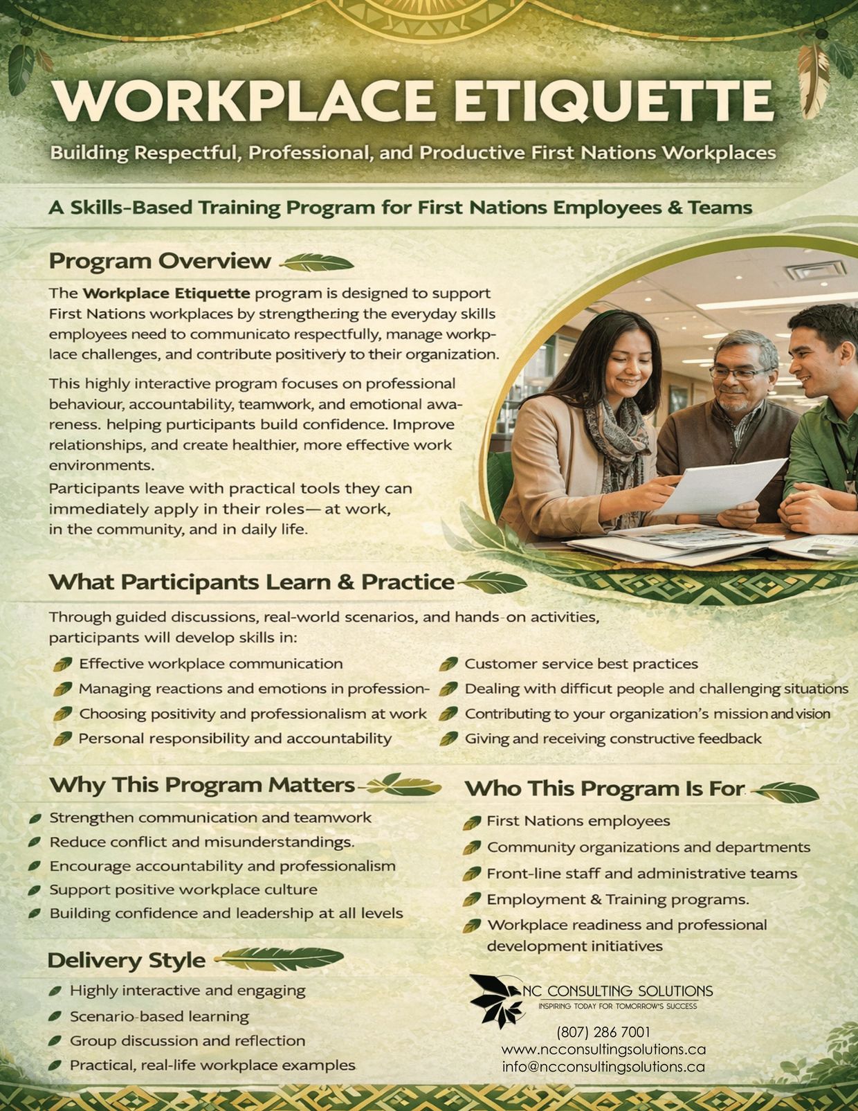 If your community is looking for a practical, First Nations–focused employment readiness workshop, Workplace Etiquette equips participants with the skills and confidence needed to excel in the workforce and represent themselves and their organizations with professionalism.
